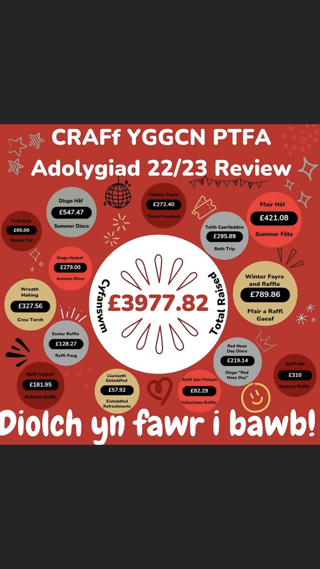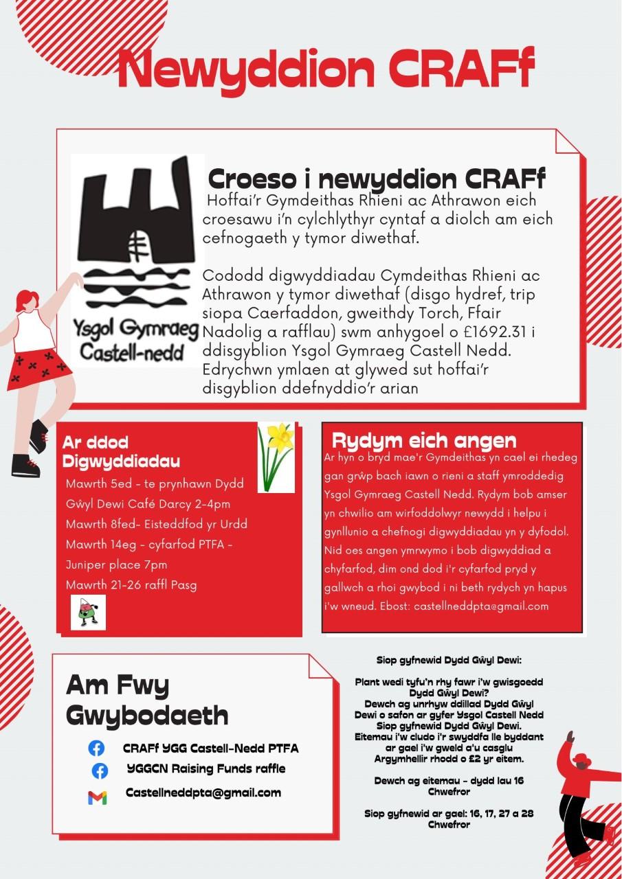 Mae pwyllgor y CRAFf yn cwrdd ar ail Ddydd Mawrth bob mis er mwyn trefnu digwyddiadau hwylus i'r plant ac i gymuned yr ysgol. Am fwy o fanylion cysylltwch gyda swyddfa'r ysgol.