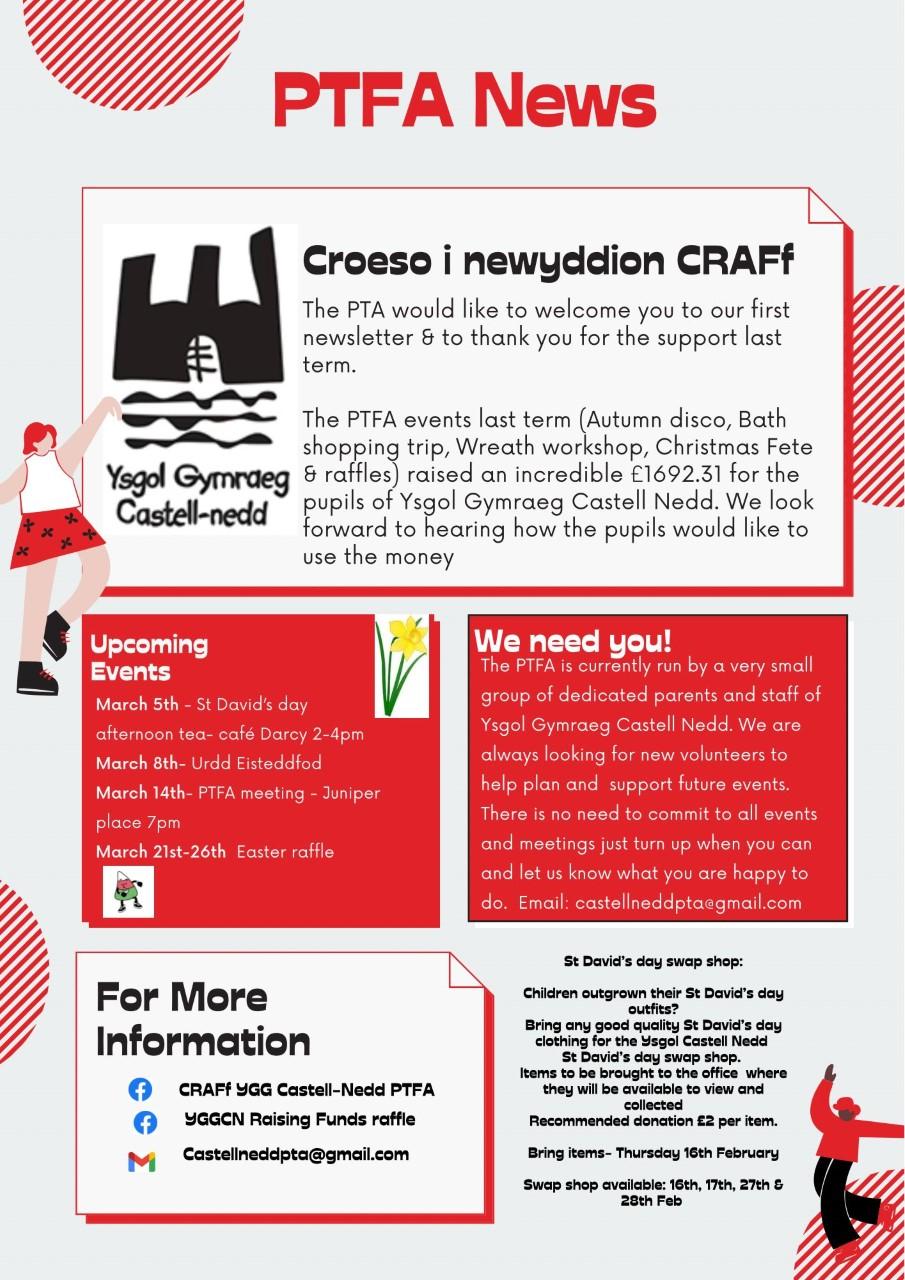 The Parent, Teacher and Friends of Castell-nedd work together to support the school in a variety of ways with the children's best interests at the heat of their efforts. They aim to enrich and improve the environment and provision available to the children whilst they are pupils at Castell-nedd.
